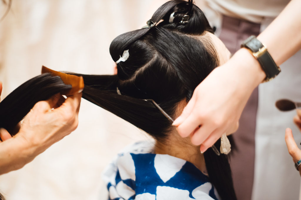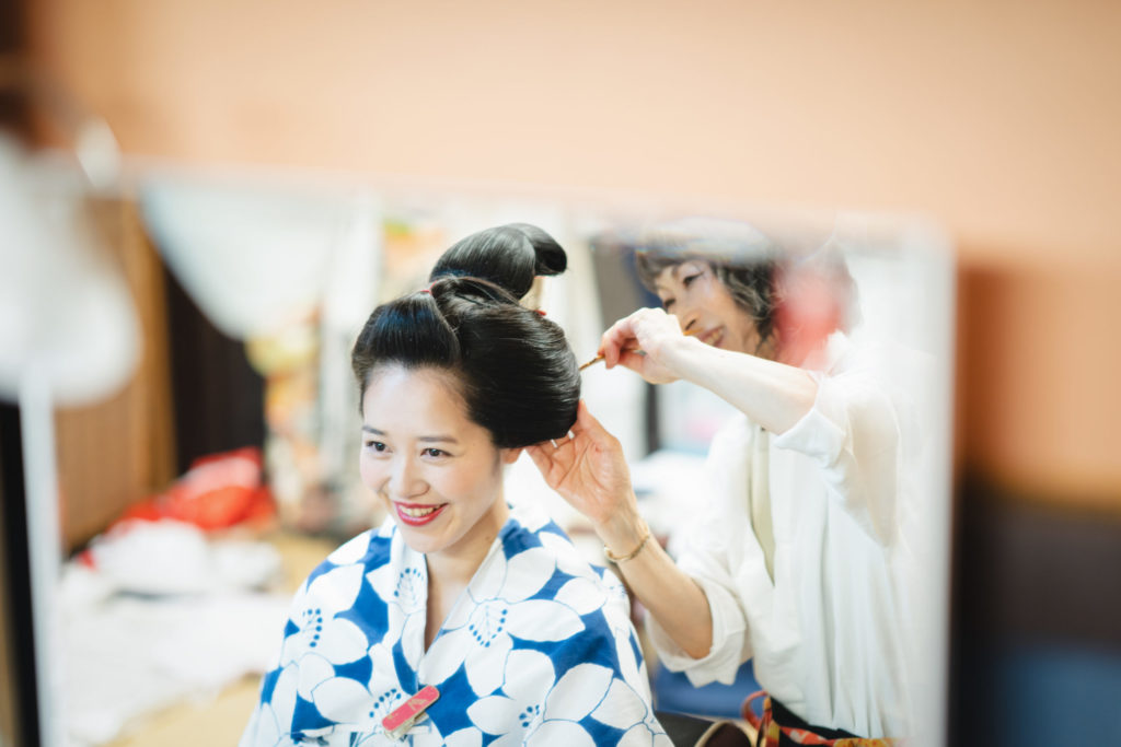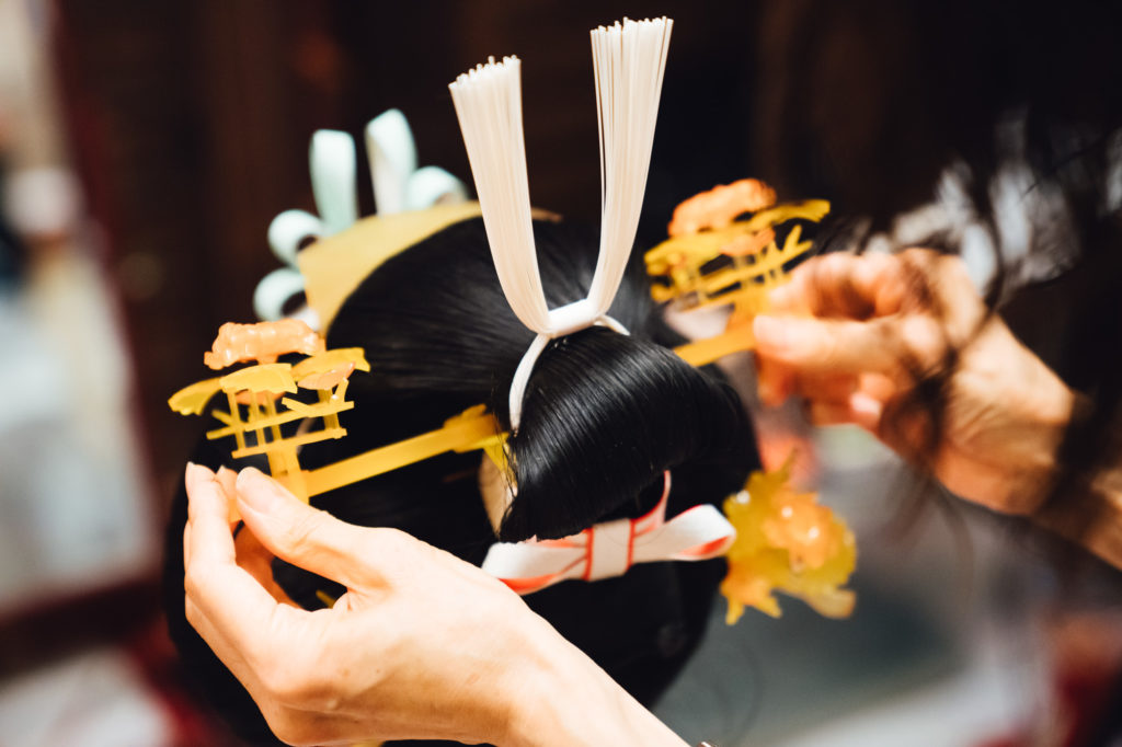 京都の結師の伝統的な技法で、ピンやゴムなどを使用しない髪結いを行います。肩下5センチほどの髪の長さがあれば、地毛でかつらよりもナチュラルな日本髪を結うことができます。